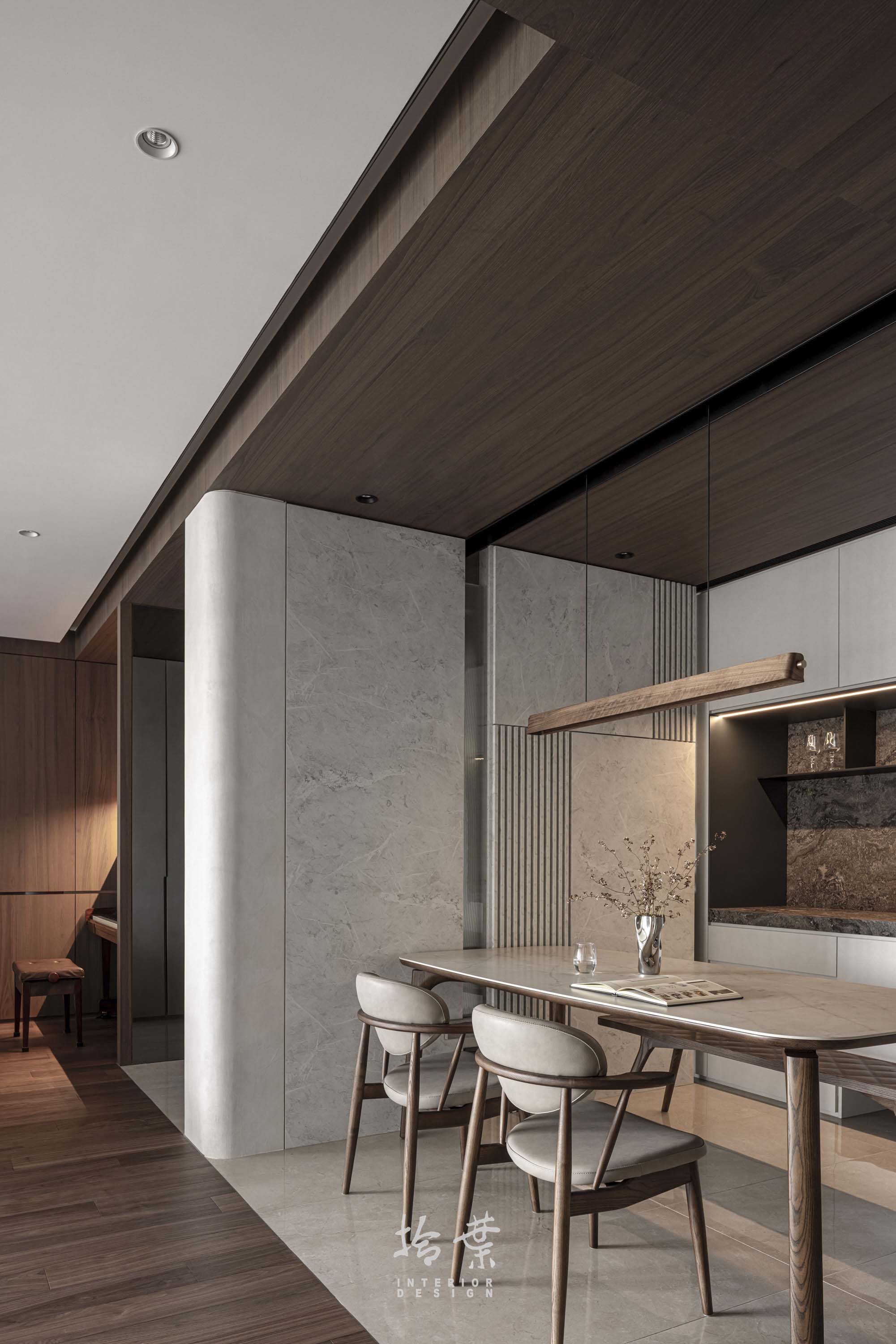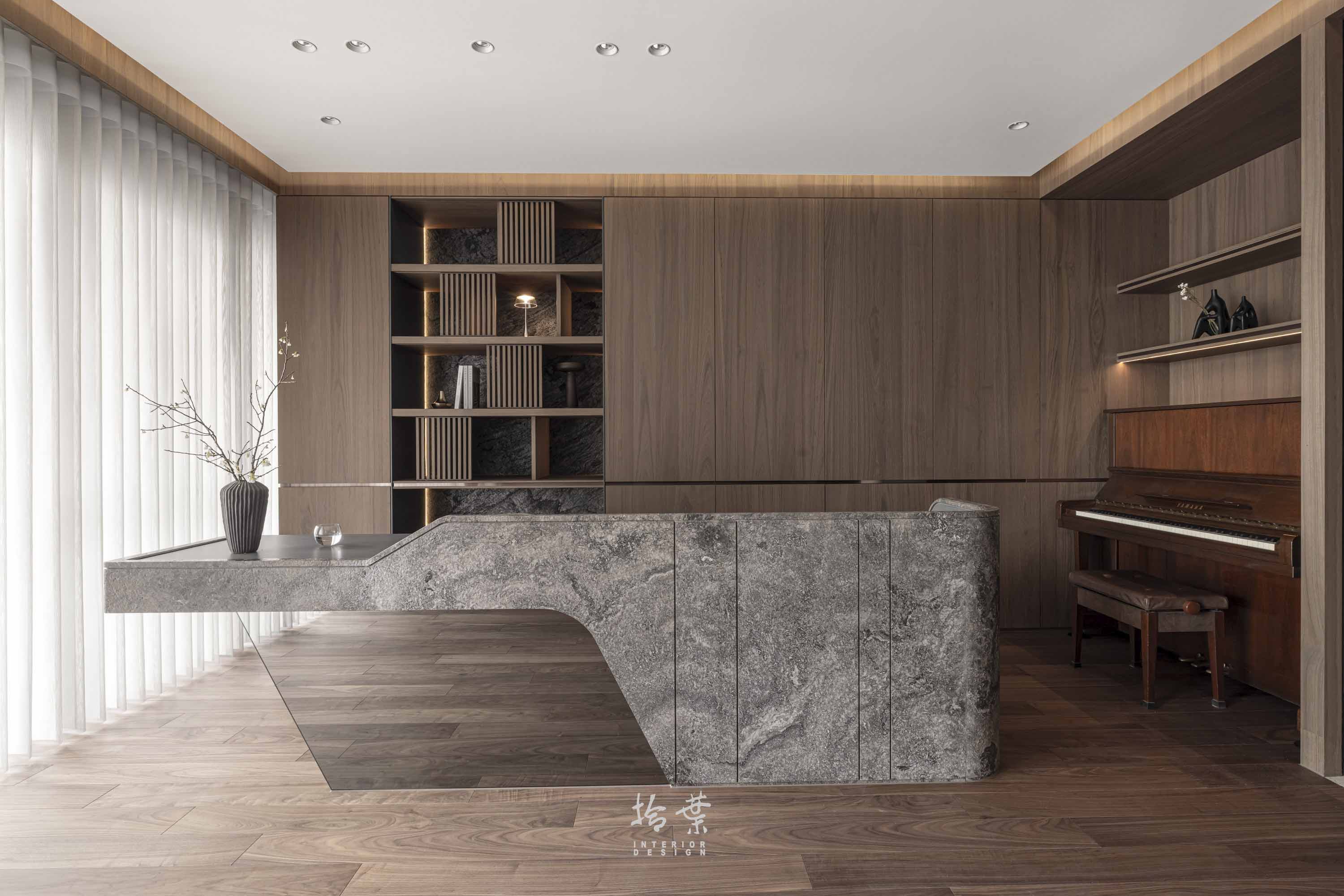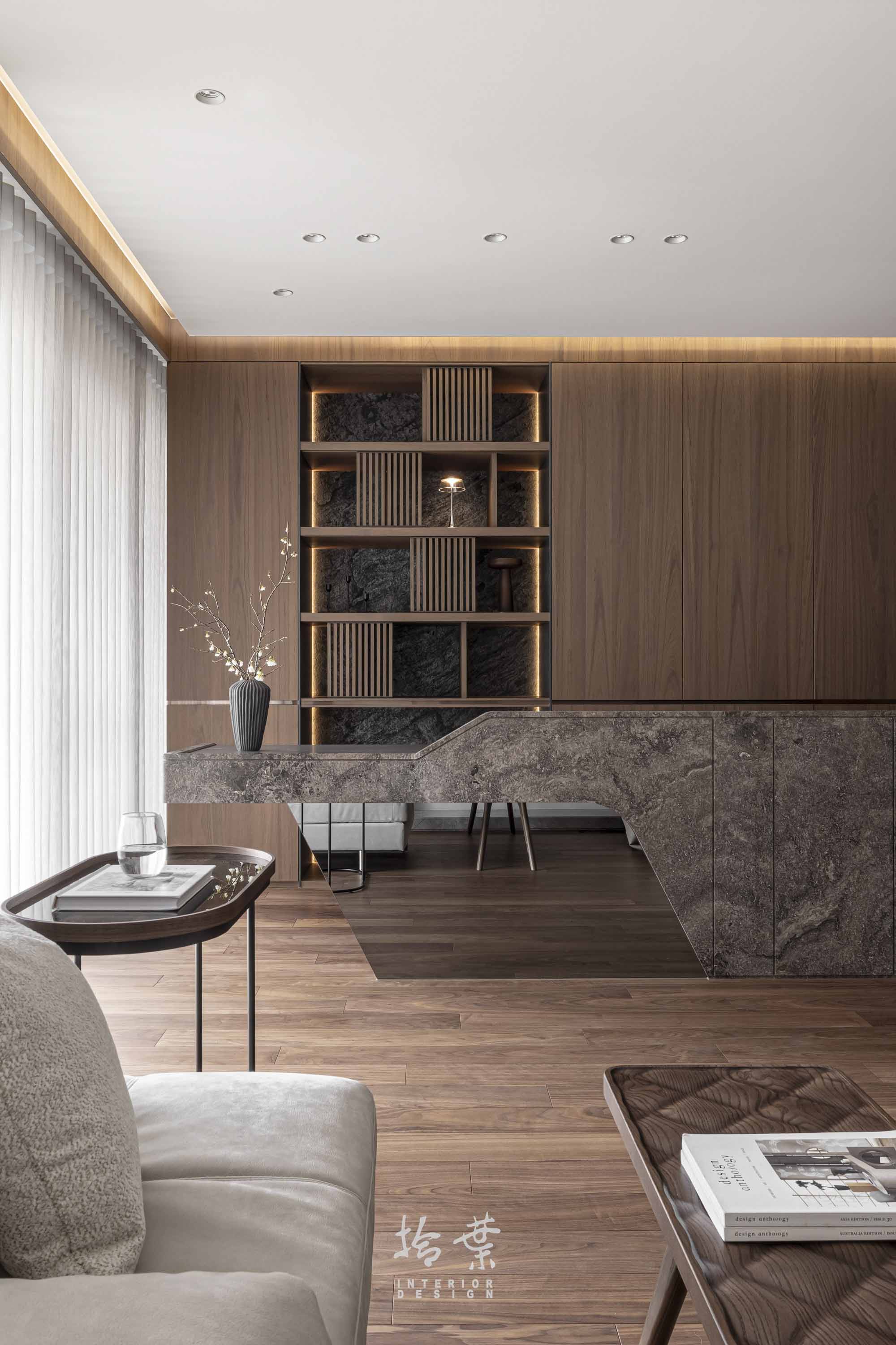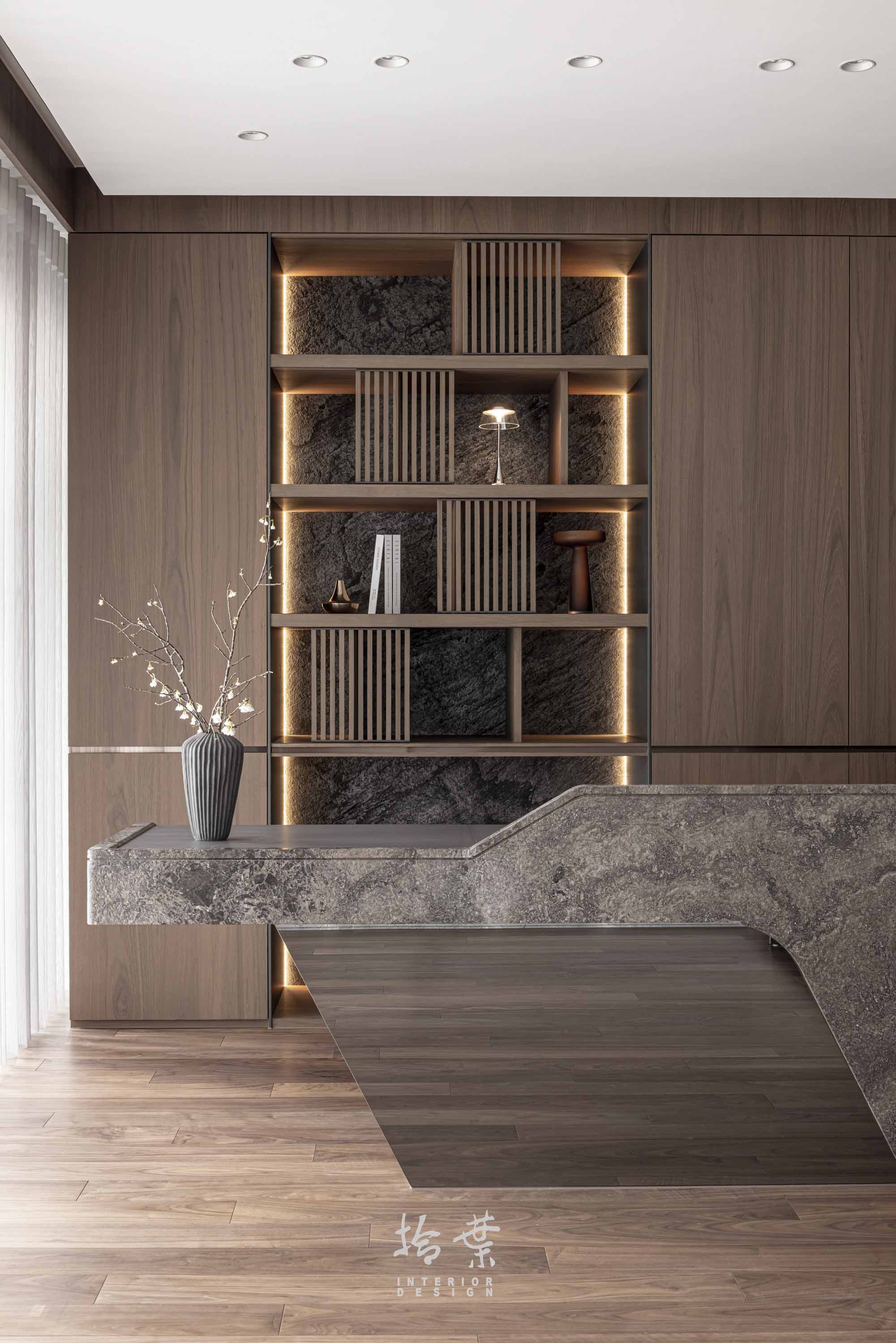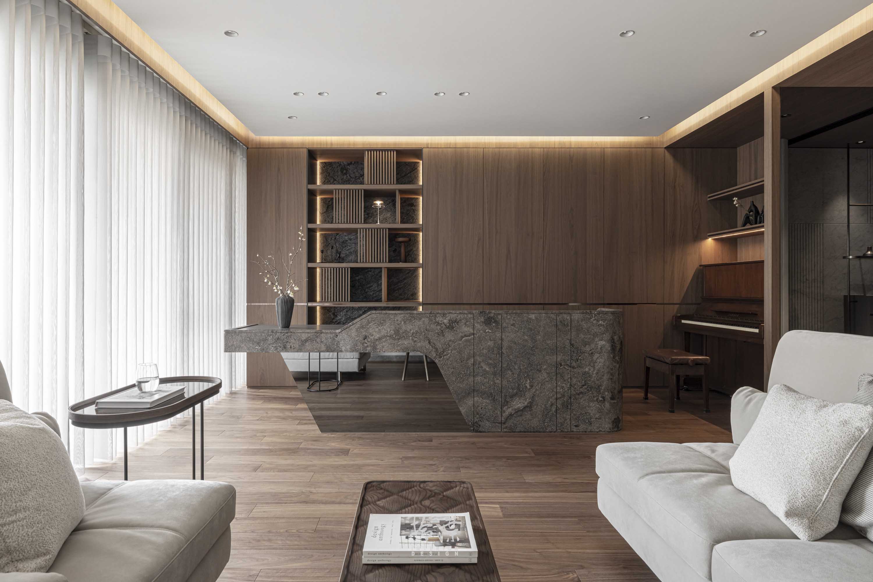 以岩石的厚度與木質的溫度為核心語彙 透過大面積深色木皮鋪陳空間基底 建立沉穩且連續的視覺秩序