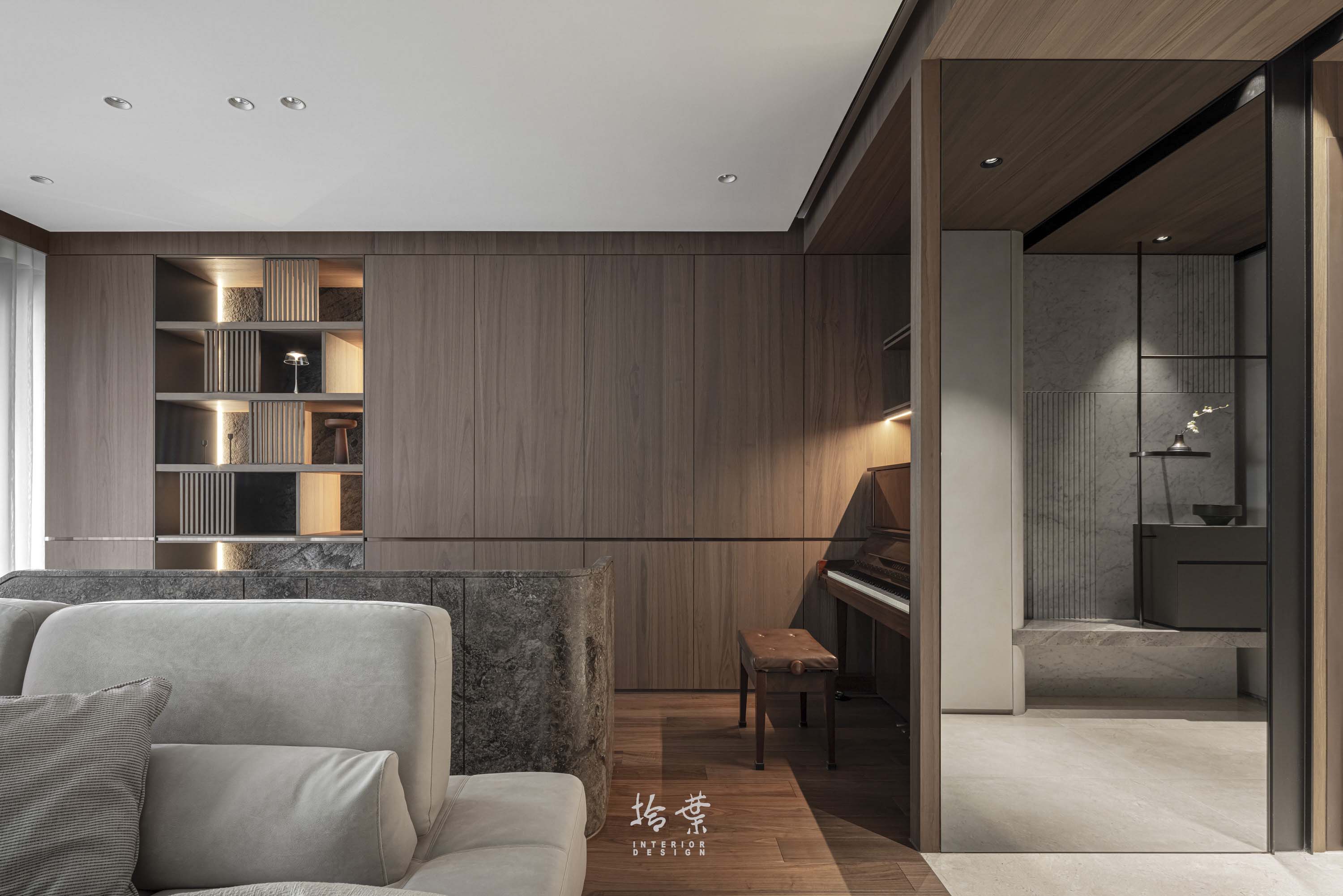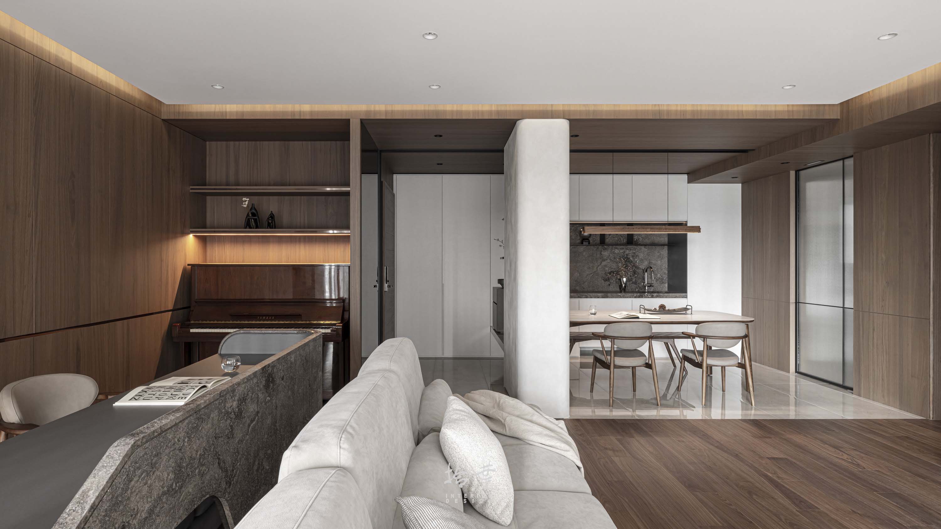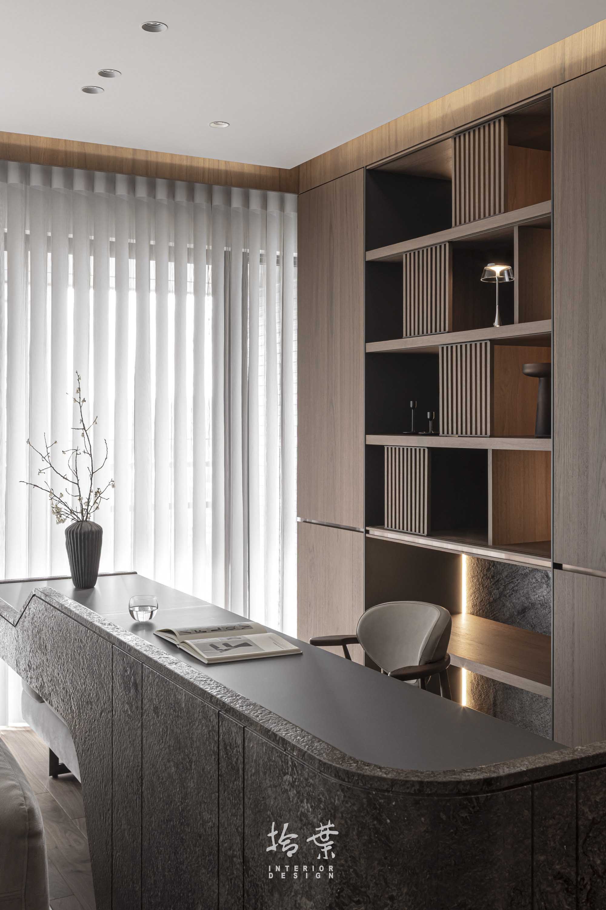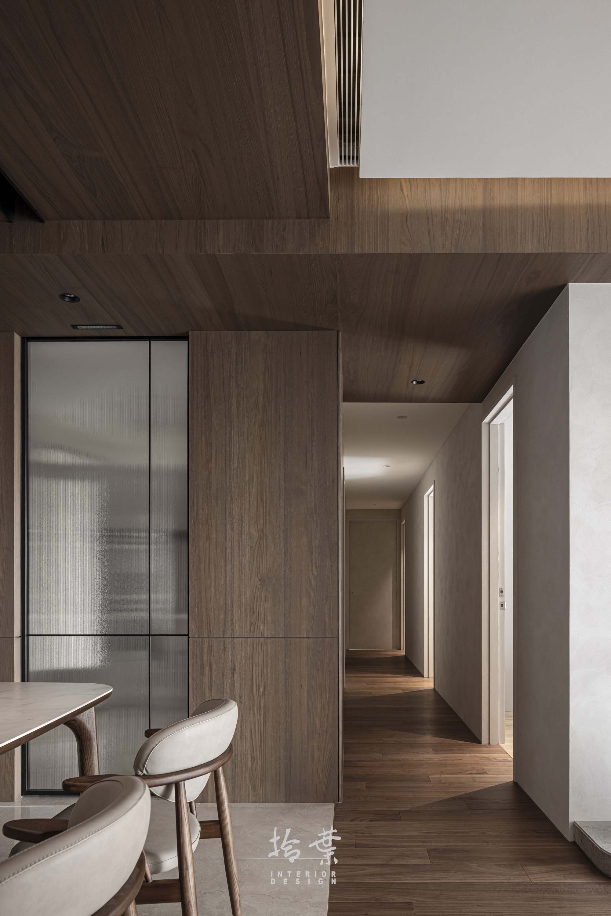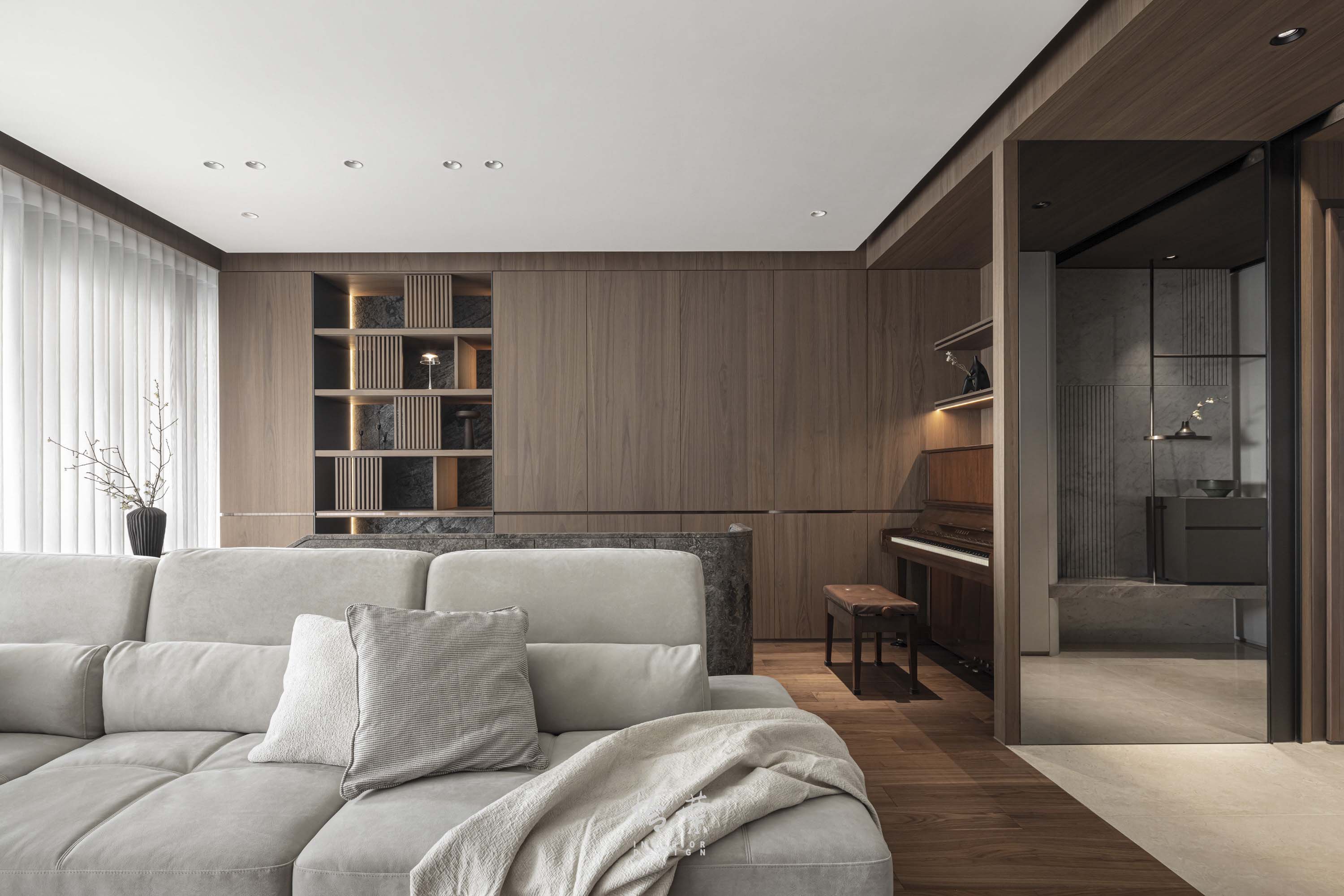 以岩石的厚度與木質的溫度為核心語彙 透過大面積深色木皮鋪陳空間基底 建立沉穩且連續的視覺秩序