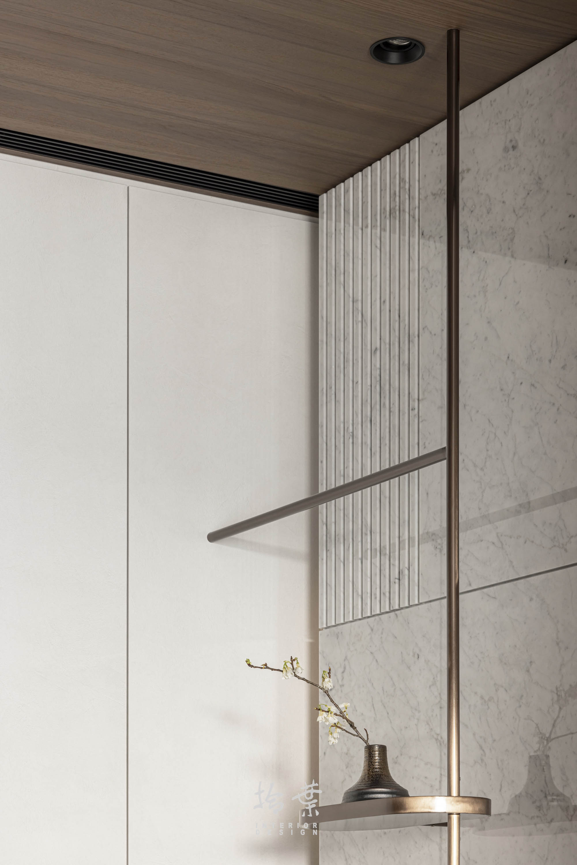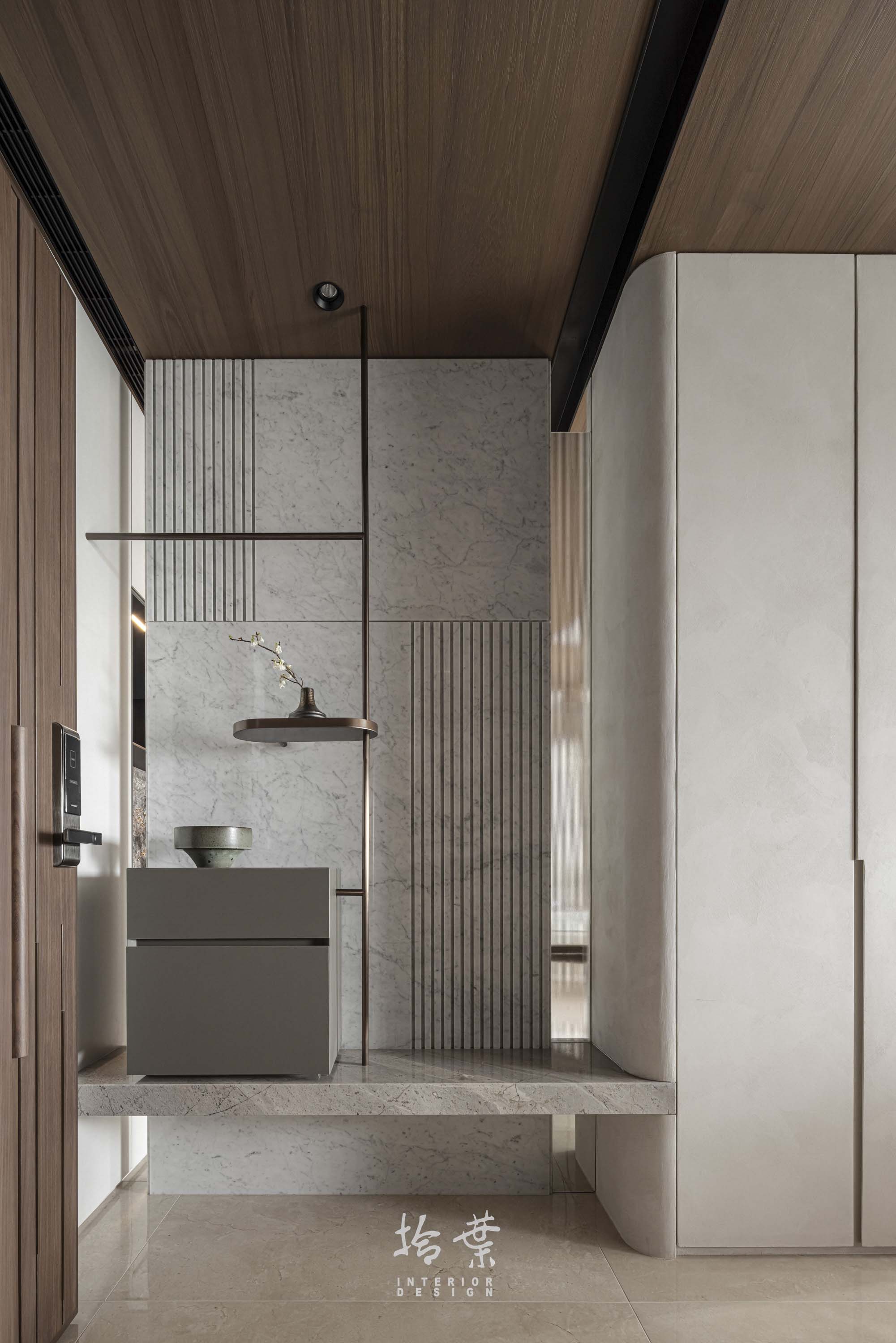 間接光源隱於結構之中,柔化石材的重量 同時平衡木質的深色調,使冷暖之間取得細膩的和諧
