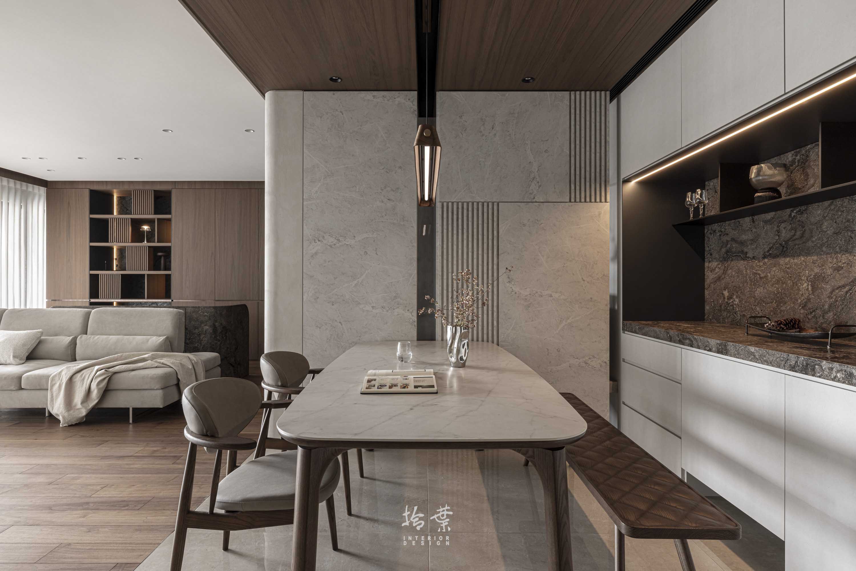 礦物感石材延伸於檯面與立面 保留自然紋理與層理肌理,使空間蘊含時間沉澱的質感